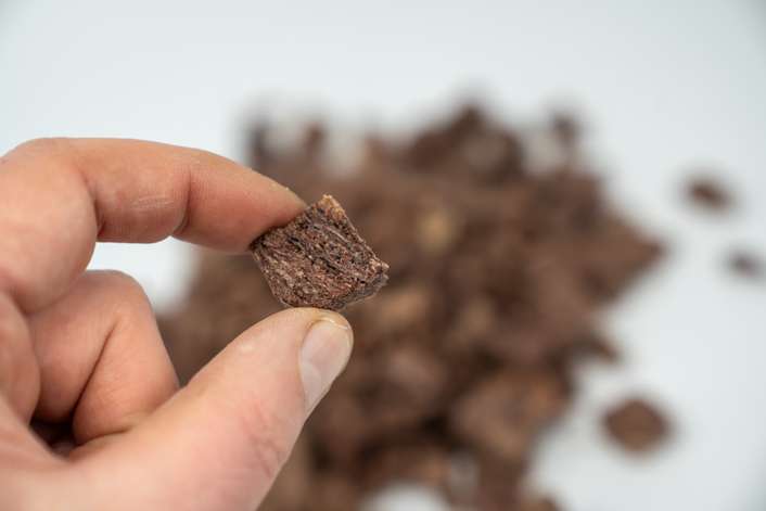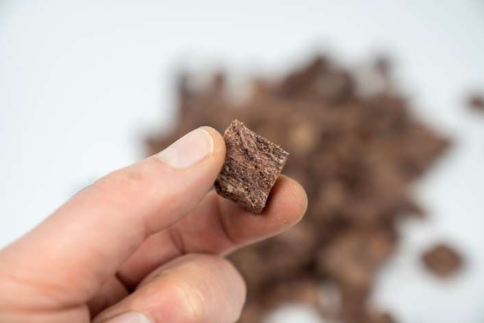 Zum Verfüttern empfehlen wir, das Futter ca. 10 Minuten in Wasser einzuweichen.