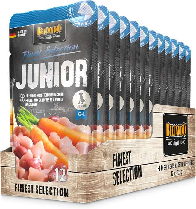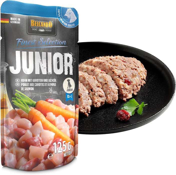 BELCANDO Junior Huhn mit Karotten ist ein hochwertiges Nassfutter, speziell entwickelt für junge Hunde. Die Rezeptur kombiniert zartes Hühnchen mit frischen Karotten und liefert damit wichtige Nährstoffe für eine gesunde Entwicklung. Der praktische Frischebeutel sorgt für einfache Portionierung und bewahrt den Geschmack optimal. Ideal für die tägliche Fütterung – im praktischen Vorratspack mit 12 Beuteln à 125g.
