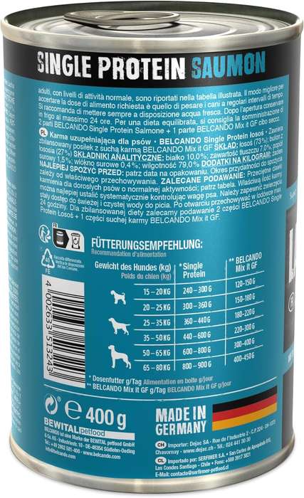 Für eine ausgewogene Ernährung empfehlen wir die Fütterung von 2 Teilen BELCANDO Single Protein Lachs + 1 Teil BELCANDO Mix it GF Trockenfutter. Durchschnittswerte für die Fütterung von ausgewachsenen, normal aktiven Hunden sind in der separaten Tabelle aufgeführt. Die richtige Fütterungsmenge lässt sich am besten über eine regelmäßige Gewichtskontrolle des Hundes ermitteln. Frisches Trinkwasser sollte immer zur freien Verfügung stehen. Nach dem Öffnen max. 24 Stunden im Kühlschrank aufbewahren. Bitte zimmerwarm füttern.