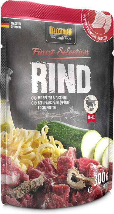 Für Dein Spätzelchen wollen auch wir nur das Beste. Deshalb haben wir bei dieser Sorte neben hochwertigem, saftigem Rindfleisch einen ganz besonderen, schmackhaften Sattmacher ins Spiel gebracht: Spätzle! Die Eiernudeln nehmen den Fleischsaft besonders gut auf und verwöhnen den Gaumen Deines Vierbeiners. Mit Zucchini geben wir noch eine weitere nährstoffreiche und leicht verdauliche Zutat hinzu, die auch für sensible oder wählerische Hunde eine leckere Abwechslung bietet. Ein weiteres Plus der BELCANDO Finest Selection: weiches und glänzendes Fell dank der Extraportion Distelöl.