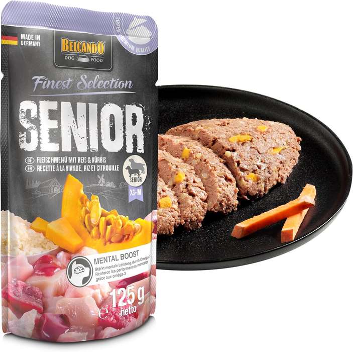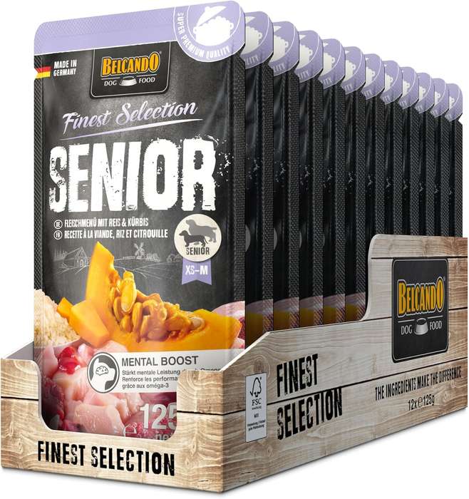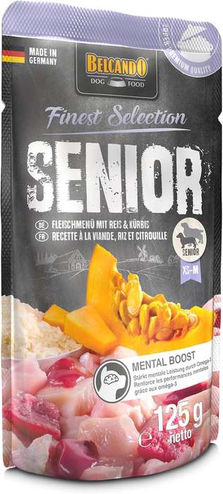 Mit dreifachem Wau-Faktor: Weil Fleisch auch im Alter für Hunde einfach der Hit ist, verwöhnen wir Deinen Senior direkt mit drei bekömmlichen Sorten in einer besonders saftigen Rezeptur. Mit seiner mild-nussigen Süße leistet Kürbis nicht nur einen geschmacklich interessanten, sondern auch gesunden Beitrag. Leicht verdaulicher Reis bietet Hunden mit verringertem Aktivitätsniveau die ideale Energiemenge, ohne dabei den Kalorienbedarf zu übersteigen. Das enthaltene Omega-3 stärkt zusätzlich die mentale Leistung Deines Seniors und trägt dazu bei, dass er auch im Alter seine geistige Fitness bewahrt. Ein weiteres Plus der BELCANDO Finest Selection: weiches und glänzendes Fell dank der Extraportion Distelöl.