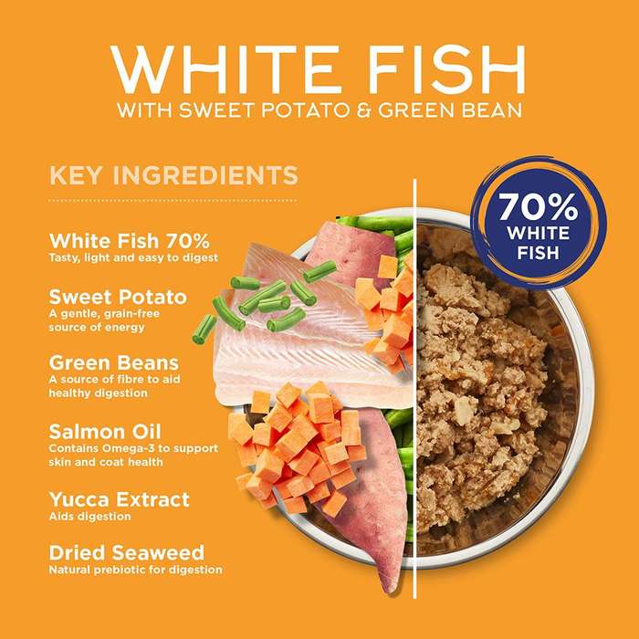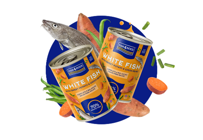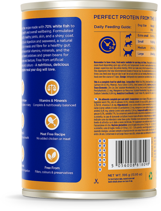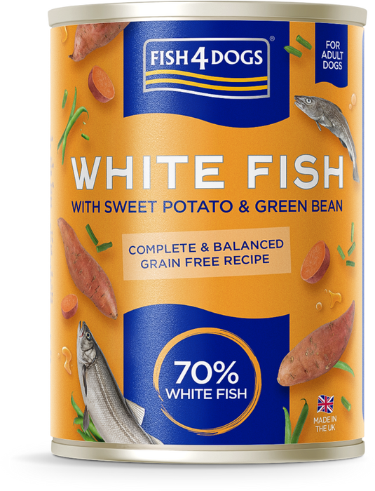 Produktbeschreibung für Fish4Dogs® Finest Weißfisch mit Süßkartoffel & grünen Bohnen – 395 g