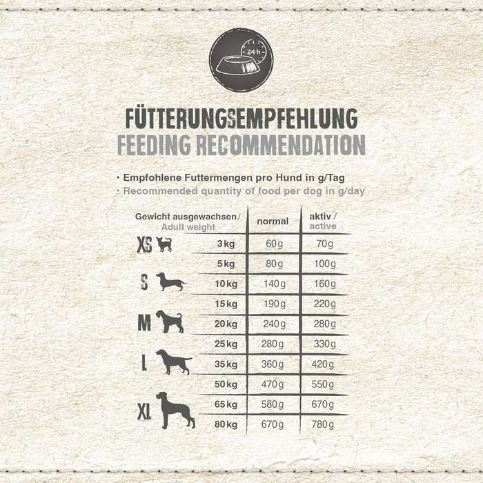 Durchschnittswerte für die Fütterung von ausgewachsenen Hunden sind in der separaten Tabelle aufgeführt. Die richtige Fütterungsmenge lässt sich am besten über eine regelmäßige Gewichtskontrolle des Hundes ermitteln. Einfach trocken verfüttern. Frisches Trinkwasser sollte immer zur freien Verfügung stehen.
