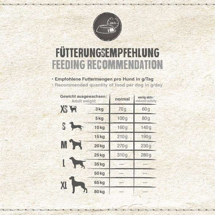 Als Besonderheit zur Förderung des Geschmacks wurde BELCANDO Finest mit einer speziellen Sauce ausgestattet. Unter sorgfältigem Anrühren von 3 Teilen BELCANDO Finest Light mit 1 Teil warmem Wasser (40-50 °C) bildet sich ein besonders schmackhafter Soßenüberzug über den Futterpartikeln. Dieser ist für wählerische Hunde eine besondere Delikatesse. Aber auch bei trockener Fütterung zeichnet sich BELCANDO Finest Light durch höchsten Geschmack aus. Durchschnittswerte für die Fütterung von ausgewachsenen Hunden sind in der separaten Tabelle aufgeführt. Die richtige Fütterungsmenge lässt sich am besten über eine regelmäßige Gewichtskontrolle des Hundes ermitteln. Frisches Trinkwasser sollte immer zur freien Verfügung stehen.