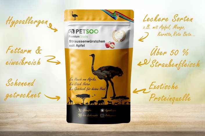 Leckerer herzhafter Snack von Petsoo aus richtig viel Straußenfleisch für alle Hunde. Eine gesunde und gut verträgliche Belohnung für besondere Hunde ;)